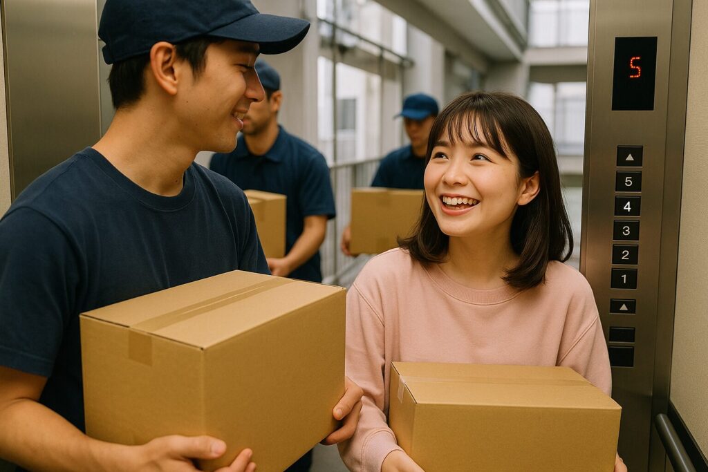 2社の引越し会社が鉢合わせになり、エレベーター前は渋滞になった。